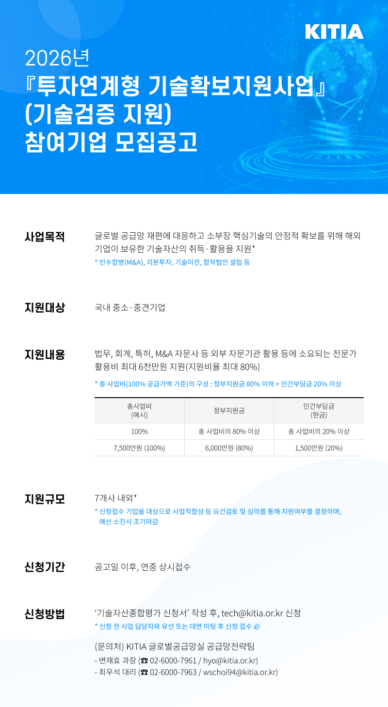 [안내/KITIA] 2026년 『투자연계형 기술확보지원사업』(기술검증 지원) 참여기업 모집공고